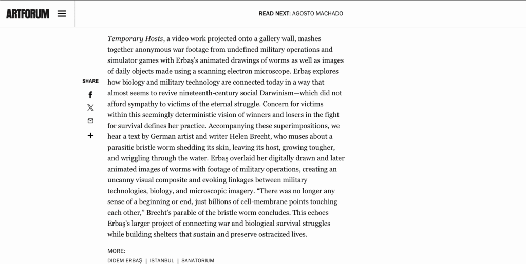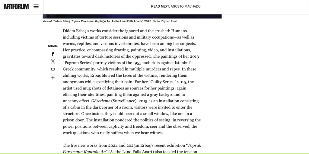 https://www.exactingclam.com/issues/no-10-autumn-2023/displacement-abstraction-and-recycled-materials-on-the-art-of-didem-erbaş/?fbclid=IwAR1Ituwz_XTvKRtK4HSpSm9fZrpOvbNZTfVct5ihnEiYrolnKysMhqnCFSg: TextsDidem Erbaş: İşlerim göç ve yerinden edilme temalarının etrafında dönüyor, TR24, Eylül 2023